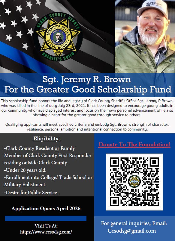 The Clark County Deputy Sheriff's Guild Community Foundation aims to enhance the quality of life in the Clark County area by providing financial support to first responders in need, as well as assisting organizations and individuals within our community.